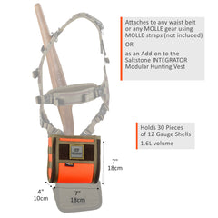 This shell pouch is a great companion for the Saltstone modular hands-free hunting vest, easily snapping onto the unit.Its construction is excellent and should last a long time. The unique flap ensures quick, easy access to over a box of shells while preventing them from falling out.Considering the quality, the price is reasonable. This is a must-have item and is recommended for the modular vest, though it could also be used with other rigs.
